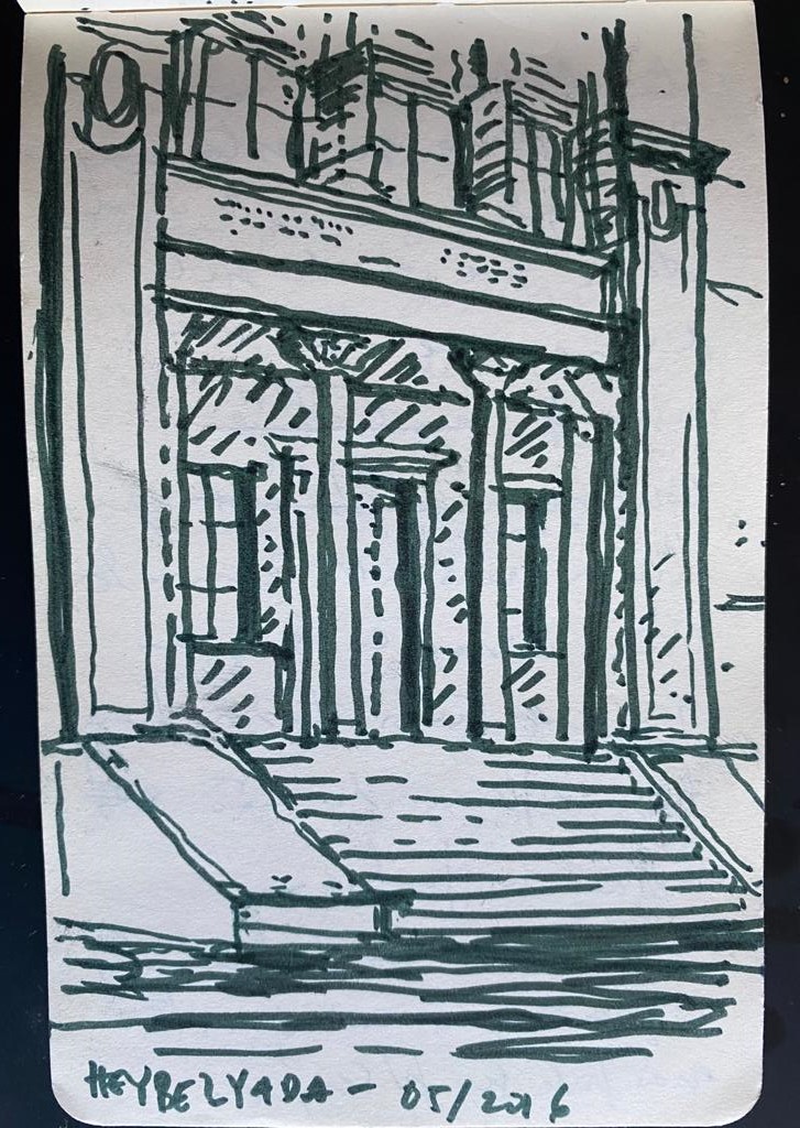 While living in Istanbul, I have been mainly concentrated in sketching buildings of the Ottoman period because it seems the best way to comprehend a different architecture from where I come from. After choosing a specific building, I take the subway or get into a taxi, equipped with Prof. Doğan Kuban (Ottoman’s Istanbul) architectural guide. After the first sketch, my walking tour starts, in flâneur mode, on the quest for more buildings to draw.