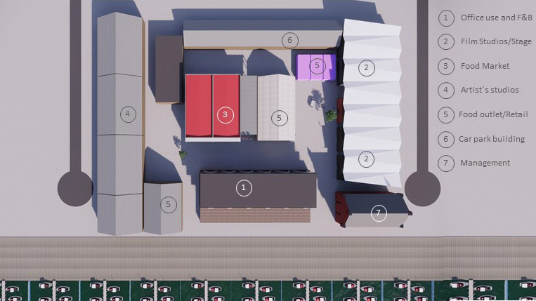 Embedded within existing buildings and carefully repairing the urban texture, this mixed use compound with offices, artist´s studios, theater student´s rehearsal zones and stages, a food market and car park facilities enables the solution to dine at open air that seems to be the best solution for the next time.