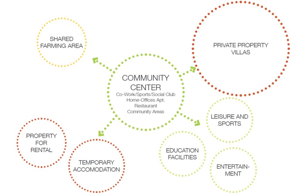 We believe that within a different frame, similar communities will thrive in the coming years. Associating the comfort of modern life with the country side life style. The possibility of permanent access to channels of information via the internet, enables everyone to be connected and take part in a wide range of business activities which doesn’t necessarily engage with the place where people live. We should add to this the advantage of being close to nature and the fact that the in-habitants are able to manage a community towards common goals, which aim towards a more balanced work-life dynamics.