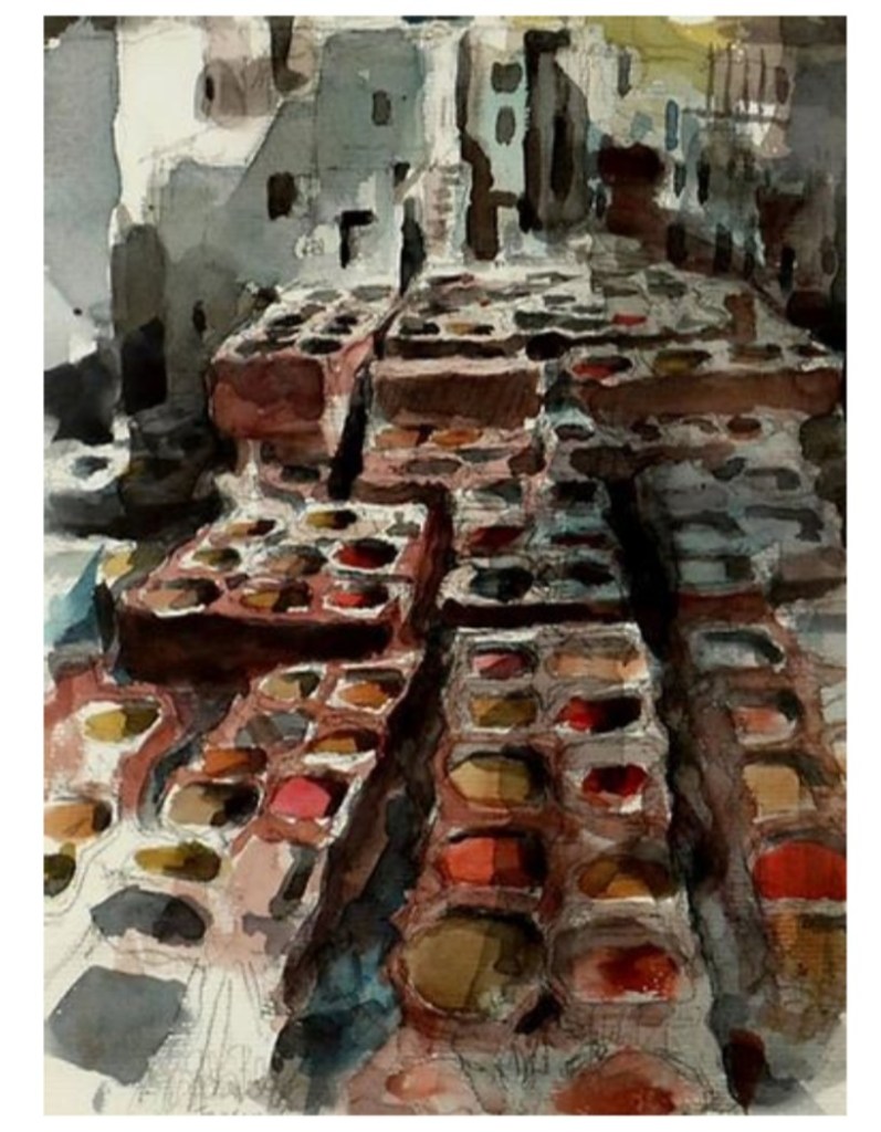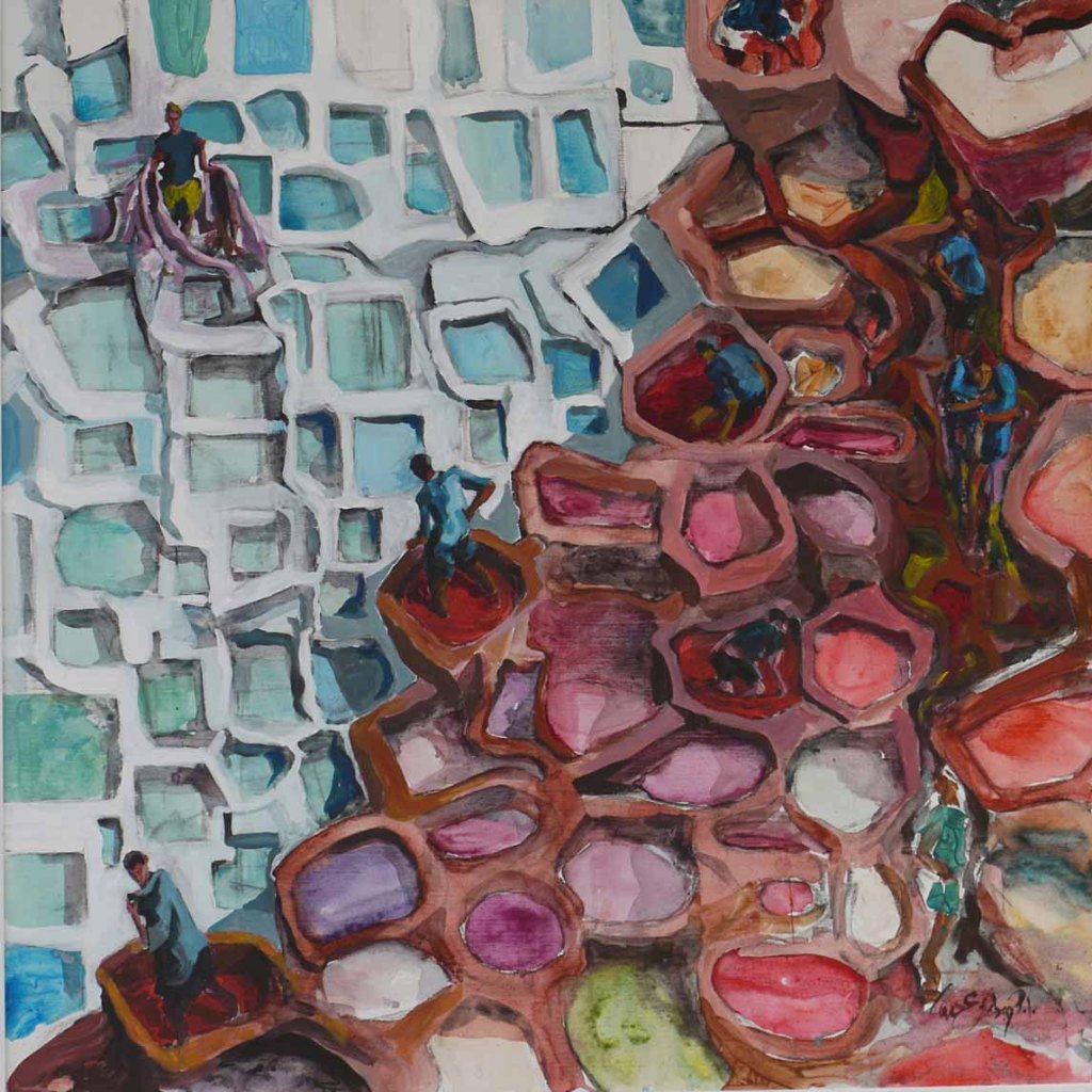 ”En Fez descubrí una paleta gigante. Los tintes de Fez son el ejemplo arquitectónico de eso, el pigmento artificial en bruto y a lo grande. Aquí empezó una constante que he seguido en mi obra, la figura en su fondo (En un principio perspectivo y finalmente plano). Alguien me dijo que lo que yo hacía era REALISMO METAFÍSICO. Es cierto que los seres que aparecen en mis cuadros aun saliendo de este mundo parecen querer pertenecer a otro.”