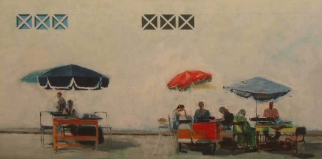 ”Tratan los cuatro lienzos una paradoja que descubrí en la medina de Rabat. Se superponen dos muros, el de la realidad y el del lienzo que lo representa. El de la realidad se corresponde al cerramiento lateral del mercado central de verduras de la ciudad. En su parte superior se abren unos huecos, que dejan de ser huecos para ser símbolos. Son los vigilantes abstractos de los protagonistas que cada día se dan cita en este lugar. “Les dáctilos et les plombiers”, humanos al límite del ser y del no ser.”