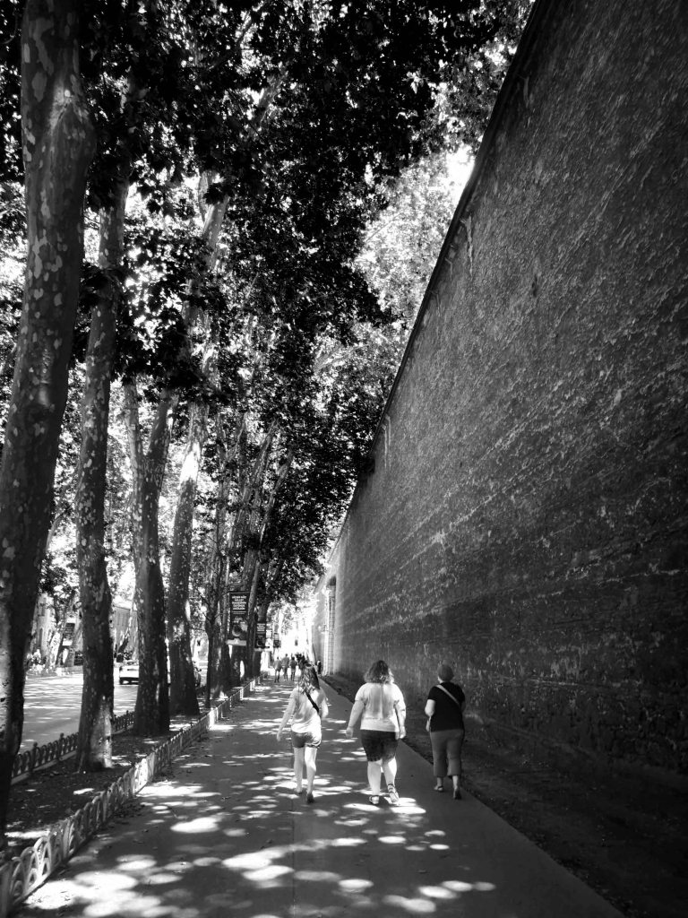 For an architect, one of the most striking features of the whole project is the fact that the buildings are designed towards the Bosporus and not facing the city. Its display of Rococo detailing and complicated overdesigned elements are shown to the ones arriving from the sea or passing by boat. On the opposite side, the façades facing the Dolmabahçe Avenue, are mostly hidden by high walls and can only be partially seen from the outside through the few monumental gates placed along them. Only the visitor or the Bosporus traveler can get a full vision of the large elongated construction.