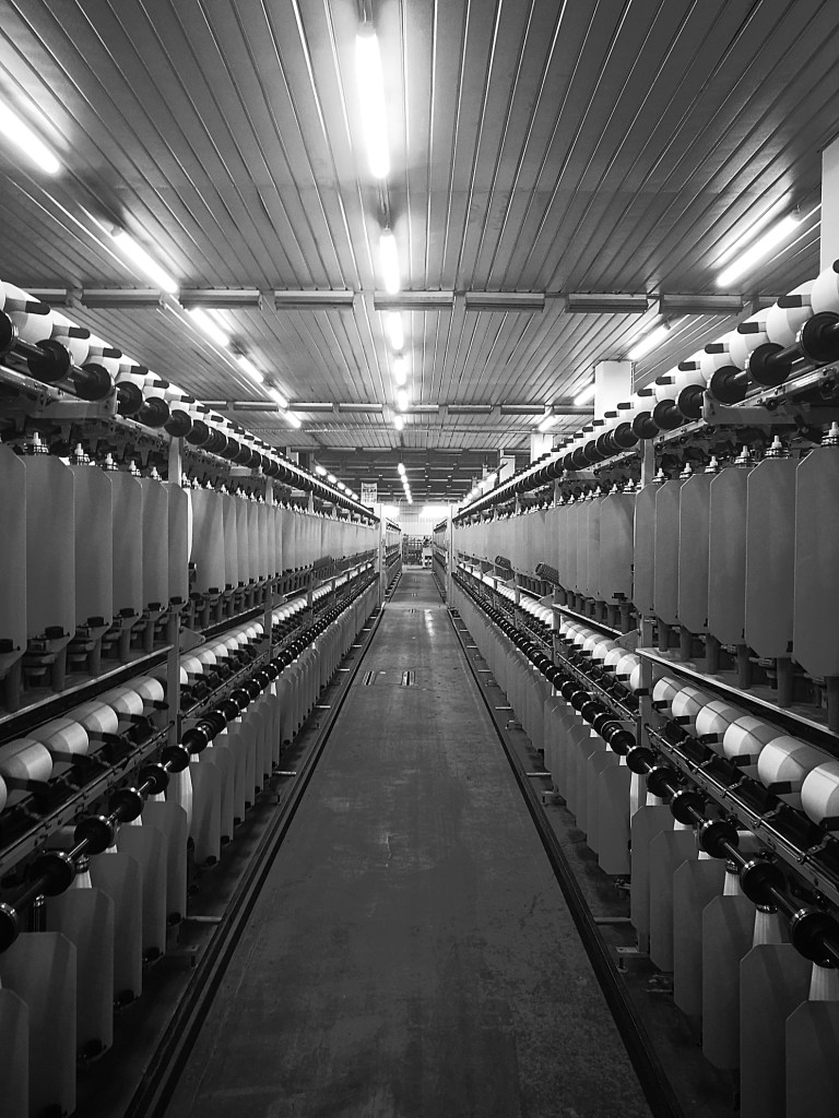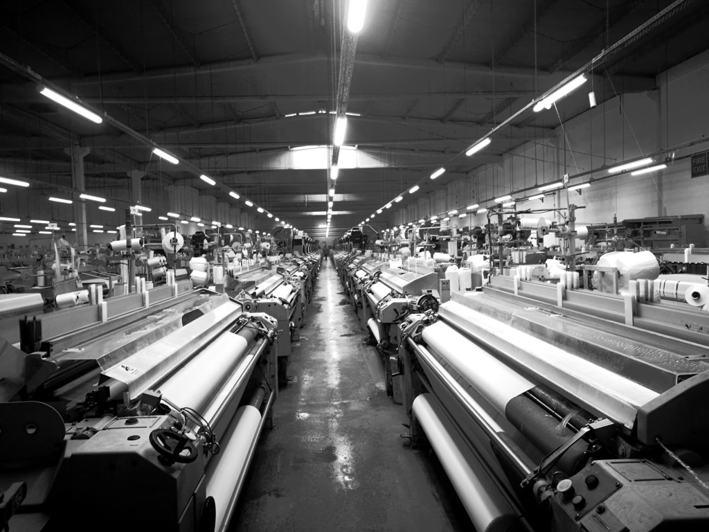 In the portraid textile factory, which could be anywhere, in China, Bangladesh or Vietnam, the “form follows function” motto of modernism is taken to its maximum level. Without any design ambitions beyond practical reasons.