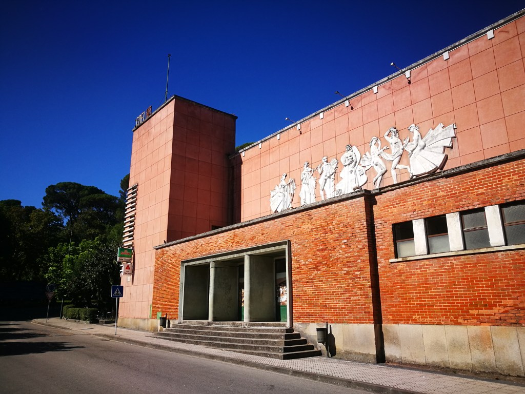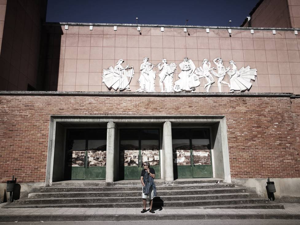 The Alves Coelho Theater was designed by the multi-faceted architect Mário de Oliveira. Through his long life and career he was also acclaimed by his paintings and dedication to the art field. And it is probably for that reason that he brought to this small project the sculptor Aureliano Lima and the painter Guilherme Filipe. This was a common characteristic of such building typology during the dictatorship times. Given its relation with culture, it was usual to integrate other arts into the project. In this case, we can see the representation of several performers in the bas-relief sculpture attached to the main façade, over the entrance doors, introducing movement and expression to the hyper-functionalist composition of the building.