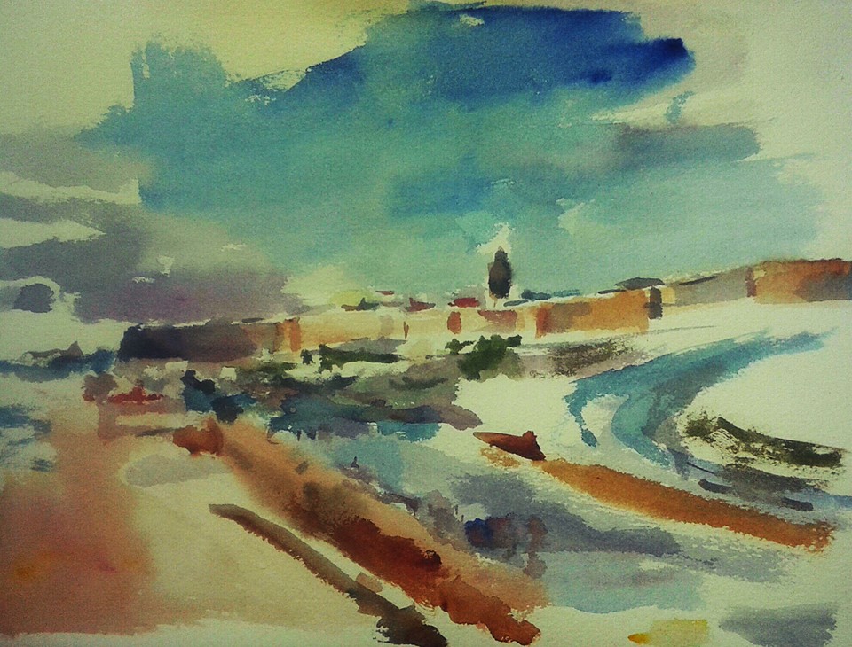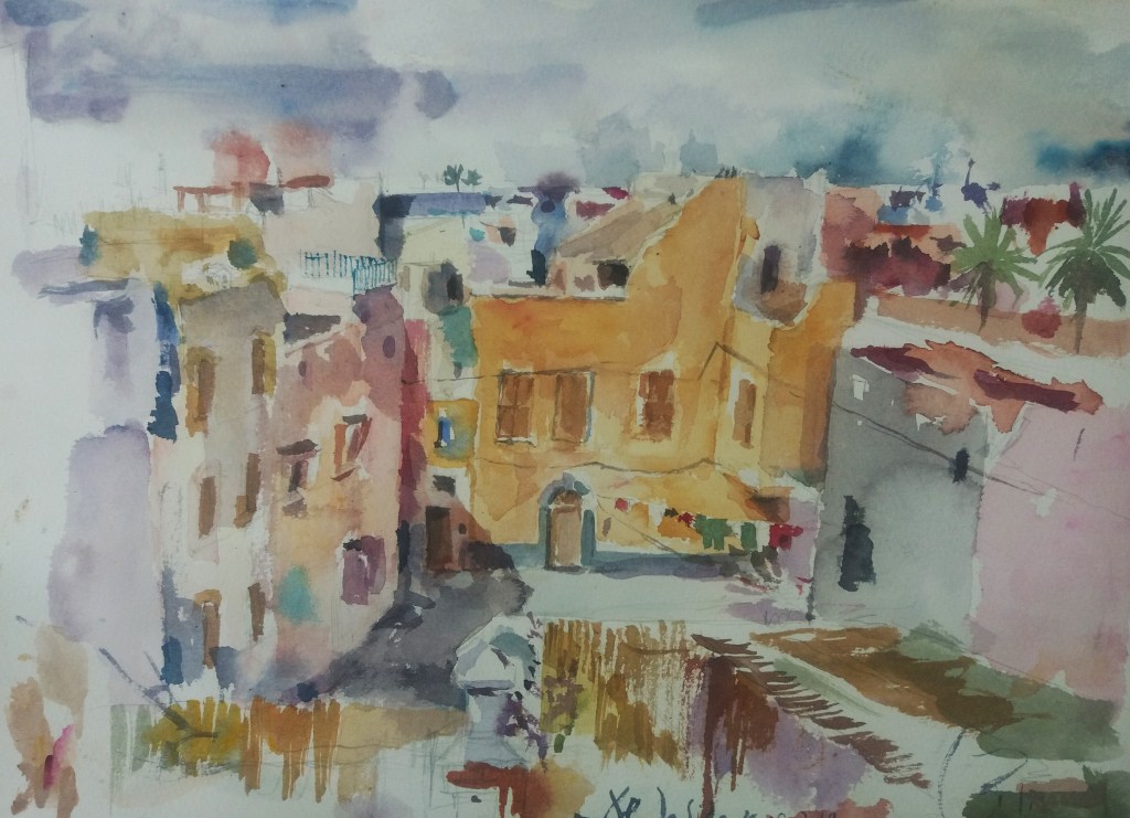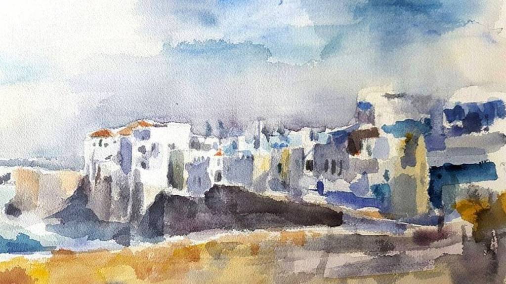 Es curioso que esa pregunta me la haga un portugués. El origen de la arquitectura fortificada al lado del atlántico es al 100% portuguesa. No hay que olvidar que tanto Asilah, como Rabat, Essaouira, Al Jadida, y otras más, son enclaves en su inicio Portugueses. Y fíjate lo curioso, un país en la misma latitud que Portugal, idéntico en sus costas, no pueda decirse que sea un país que mire al océano. Nada que ver con Portugal, un país en el que se respira el océano ya en el momento que atravieso la frontera de Zamora en Miranda do Douro. Lo presiento en su arquitectura a más de 400 km. En Marruecos, esta relación es inversa. Esa imagen que me propones en la pregunta, me trae una de mis acuarelas, la de las Oudayas de Rabat. Ese enclave era Portugués.